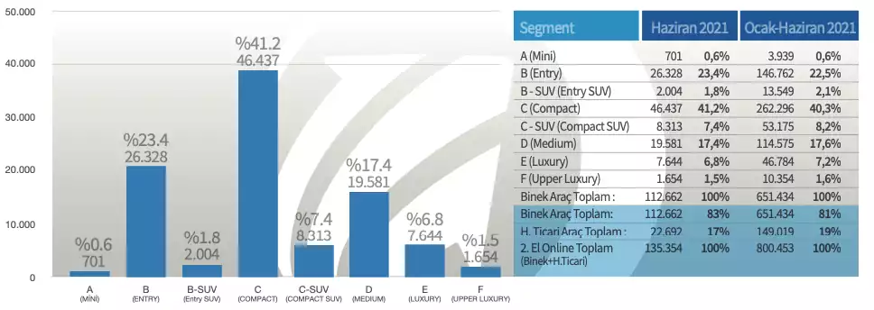 Ülkemizde C Segmenti araçlar özellikle çok fazla satılıyor. Haziran ayında satılan ikinci el araçların %41.2 si, 46.437 adet araç satışı ile Compact Segment olarak adlandırılan C Segmenti Araçlar dan oluşuyor. C Segmentinde SUV sınıfında da hatrı sayılacak bir rakam olduğunu görüyoruz. Haziran ayında toplam C-SUV satış rakamı 8.313 adetle toplam liste içinde %7.4 lük bir paya sahip. Türkiye de ikinci tercih ise B Segmentin deki araçlarda bulunuyor. B Segment araçların Haziran ayındaki ikinci el satış rakamları ise 26.328 adetler civarında. Bunu tabii ki yine B Segment Araçlar sınıdında bulunan SUV kasa tipindeki araçlar takip ediyor. B Segment SUV Araçlar 2.004 adet satışla toplam hacim içinde %1.8 lik pay almış durumda.