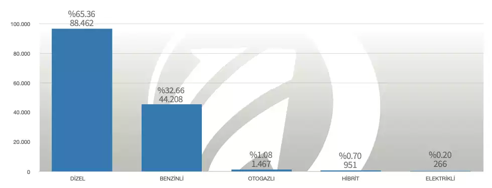 Satılan araçların %65.36 sını Dizel yakıt tüketimine sahip araçlar oluşturuyor. 88.462 adet satışla en yakın rakibi olan Benzinli segmenti ikiye katlayan Dizel araçlar yakıt fiyatlarının yüksek olduğu ülkemizde birinci sırada olmaya devam edecek gibi. Listemizde artık Elektrikli araçların da ikinci el satışta olduğunu gözlemlemeye başlıyoruz. Sıfır araç satışında geçen yıla göre %400 büyüme gösteren Elektrikli araç kategorisi ikinci elde de 266 aracın satışı ile destekleniyor.