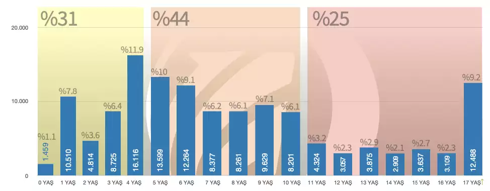 Online pazarlada yapılan satışlardan yola çıktığımızda 0-4 yaş aralığında olan ikinci el araçların toplam satış hacmi içinde %31 lik bir paya sahip olduğunu görüyoruz. Aynı şekilde 11 ile 17 yaş arasındaki araçlar da %25 lik satış adetini oluşturuyor. Tüketici ise en çok 5 ile 10 yaş arasındaki araçları almayı tercih ediyor. 5-10 yaş aralığındaki araç satışının toplamdaki etkisi %44 civarında.