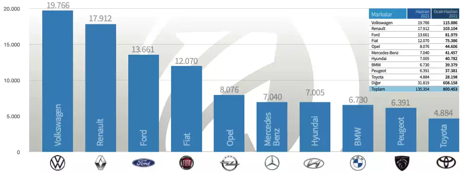 Türkiye de Haziran 2021 döneminde toplam 135.354 adet ikinci el araç satışı gerçekleşti. Bu toplam satışın yüzdelik dağılımına baktığımızda listedeki ilk 10 markanın toplam satış adetinin %77 sini (103.540 adet) oluşturduğunu görüyoruz. 19.766 adet araç satışı ile Volkswagen markası listenin en üzerinde duruyor. Listenin ikinci sırasında ise 17.912 adet satış rakamı ile Renault ve üçücü sırada ise 13.661 adetlik satışla Ford bulunuyor.
