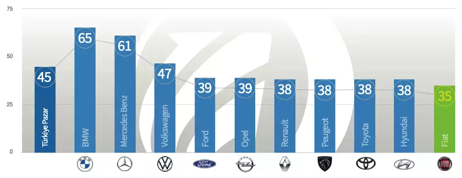 2021 Haziran ayında Türkiye 2.el online binek ve hafif ticari pazarında ortalama 45 günde araçların satıldığı gözlemleniyor. Pazarda en çok tercih edilen veya satılan araçlara baktığımızda ise satış süresi en uzun marka 65 günle BMW olduğunu görüyoruz. Yine satış süresi en uzun olan markalardan biri olan Mercedes ‘in 61 günlük bir satış süresi var. En hızlı satılan marka ise 35 günle Fiat oluyor. Hyundai, Toyota, Peugeot ve Renault markalarının ikinci el de satılma süresi ise 38 gün civarında.