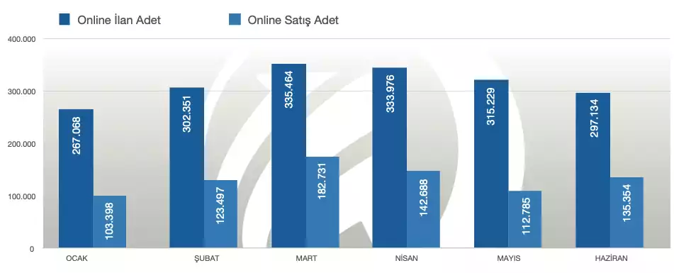 Online pazar yerlerinden alınan rakamlardan yola çıkacak olursak, 2021 Haziran ayında bir önceki aya göre yeni ilan açılan araç sayısında %6 lık bir düşüş gözlemleniyor. 2021 Ocak Haziran döneminde 2. el online pazar yerlerinde 1.851.222 adet tekil ilan yayınlanmış. Burada önemli rakamlardan biri de ilana çıkılan araçların %46 sının satılmış olması.